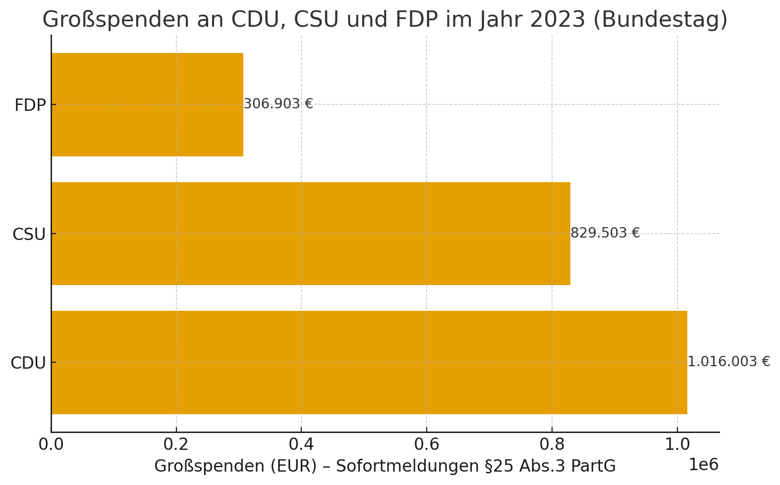 CDU ≈ 1.016.003 €, CSU ≈ 829.503 €, FDP ≈ 306.903 € (nur Großspenden nach §25 Abs. 3 PartG—Sofortmeldungen, nicht alle Spendenarten). Quelle: Deutscher Bundestag, „Parteispenden über 50.000 € – Jahr 2023“.