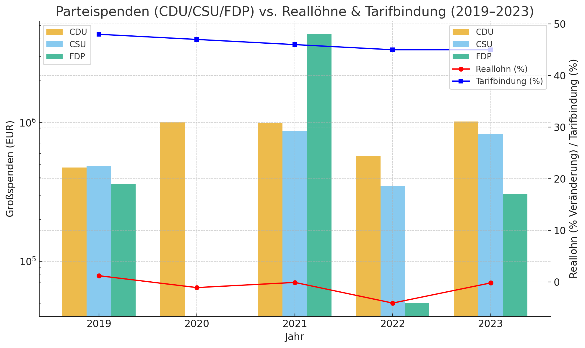 Während Spendenströme konstant hoch bleiben (besonders 2021 mit einer Rekordspende an die FDP), sinkt die Tarifbindung kontinuierlich – und die Reallöhne erlebten 2022 den stärksten Rückgang seit Jahrzehnten.